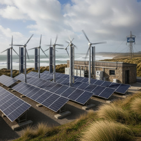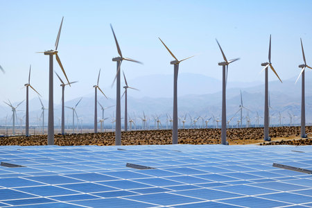 Wind turbines spinning alongside solar panels in a seamless blend of technology and nature under crisp daylight.