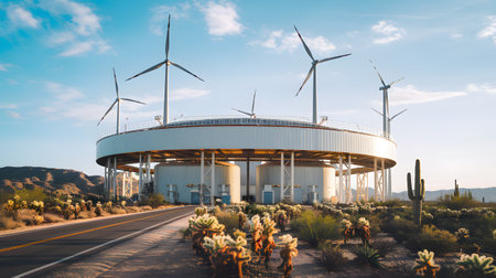 A large wind-powered fuel processing unit stands prominently against a clear sky, surrounded by vibrant desert flora. The unit reflects innovation in sustainable energy solutions.