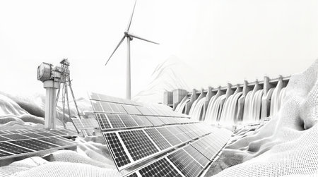 Black and white illustration of renewable energy sources, featuring solar panels, a wind turbine, and a hydroelectric dam with a dotted visual style.