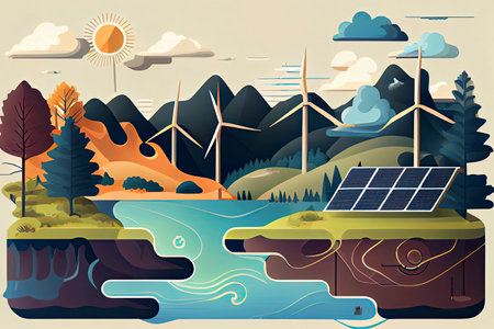 Flat vector illustration is showing alternative clean energy sources: hydro energy, wind energy.Generative AI