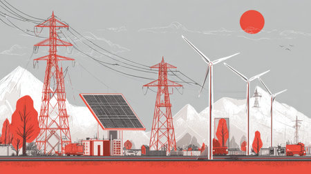 A detailed illustration of a renewable energy landscape featuring wind turbines, solar panels, and power lines against a mountainous backdrop, highlighting eco-friendly technology.