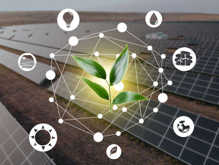 Solar farm and sun light. Solar power for green energy. Sustainable renewable energy. Photovoltaic power station or solar park. Solar panel installation and maintenance concept. Energy sustainability