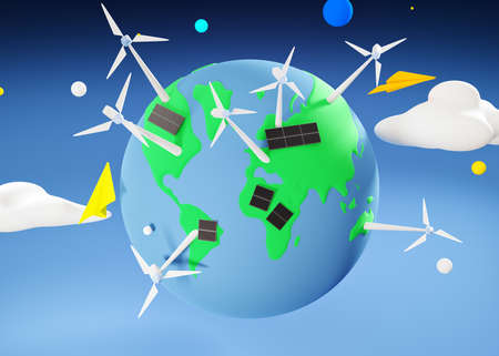 3D globe with solar panels and wind turbines on a blue background, symbolizing green energy