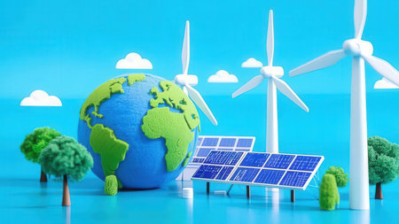 Futuristic 3D globe with solar panels and wind turbines, highlighting sustainable power.