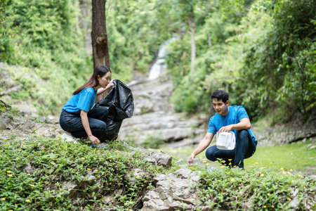 Volunteer Team Collecting Waste in Nature. Two individuals working together to clean a natural area.