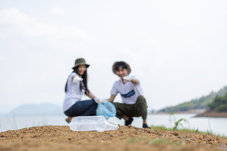 Close up Garbage plastic with blur male and female volunteers background, conducting environmental cooperation, saving world reducing global warming, Clean plastic bag waste in natural attractions.
