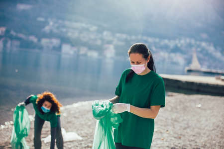 Young female volunteers collecting plastic garbage at beach