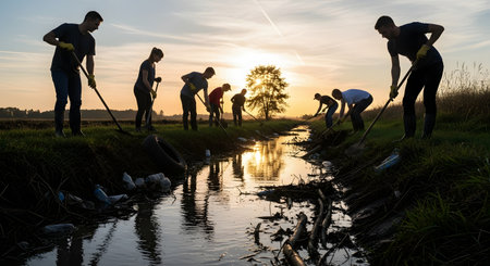 A group of volunteers are silhouetted against the sunset as they clean up a polluted riverbank. They are using tools to remove plastic bottles and other trash from the water, symbolizing environmental activism, community service, and conservation.