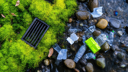 A striking depiction of pollution featuring plastic bottles and other waste amidst vibrant greenery, highlighting the importance of environmental care and awareness.