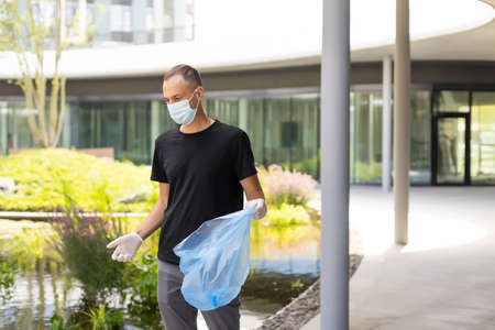man picking up plastic household waste in park
