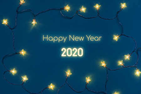 HAPPY NEW YEAR 2020 neon text on blue background.