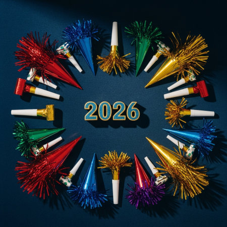 The year 2026 in wooden numbers surrounded by a festive flat lay of Christmas ornaments including baubles stars and snowflakes on a simple grey surface