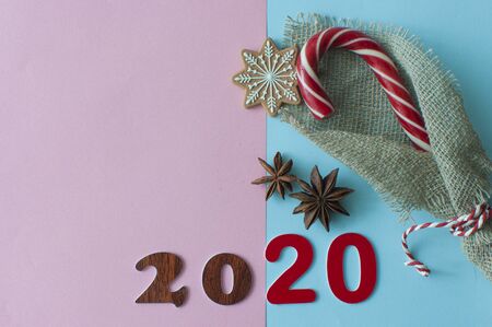 Colorful candy lollipops Christmas candy on blue and pink background. 2020 Happy new year