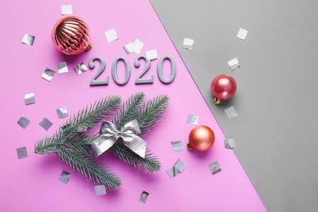 New Year celebration and festive background with 2020, snowflake and Christmas decorations top view.