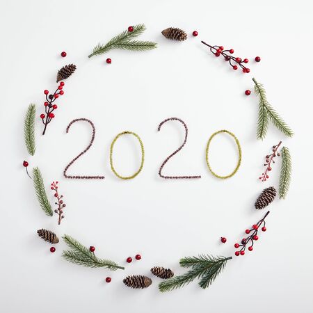 Christmas minimal concept - christmas wreath made of evergreen tree branch, pinecone and red berries. Circle composition with 2020 text inside. Mockup with christmas wreath frame.
