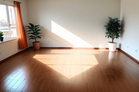 Warm sunlight fills a contemporary room with wooden flooring and potted plants, creating a serene atmosphere in the early evening.