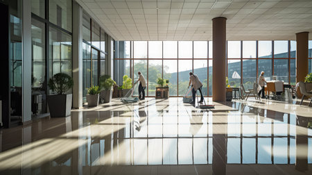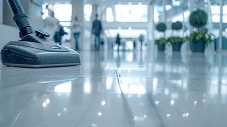 Close-up of a cleaning worker using a vacuum to clean the shiny floor in a modern shopping mall setting.