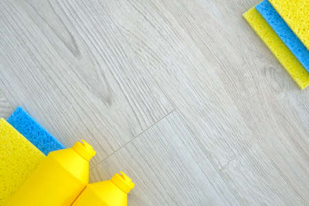 Cleaning set with tools and products on light wooden background. Cleaning service, small business idea. Flat lay, Top view.
