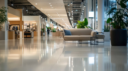A spacious retail area features stylish couches and greenery, creating a vibrant atmosphere. Soft natural light illuminates the polished floor, enhancing the modern design.