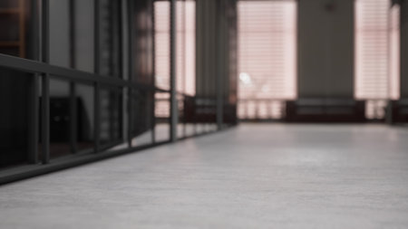 Reflection of the office hall interior on a clean marble floor. Blurred interior of an office hallway with large windows and comfortable chairs.