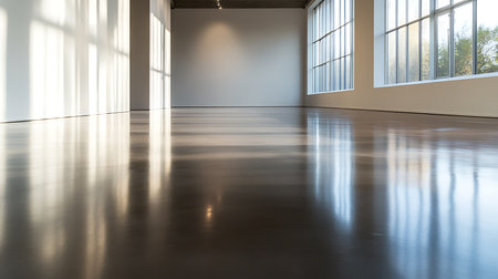 Spacious modern art gallery showcasing minimalist architecture with large windows, allowing natural light to create captivating shadows on the polished floor.