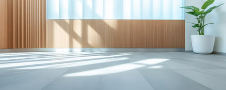 Bright natural light streams through large windows illuminating a sleek interior space with wooden accents and a potted plant. The atmosphere is calm and inviting showcasing simple elegance.