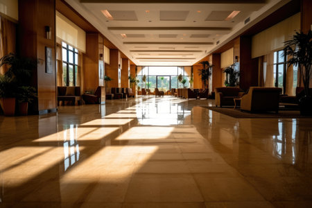 Luxury interior of modern office hall with clean marble floor and green plants, inside shiny lobby of commercial building. Concept of bank, hallway, service, company, business. Generative AI