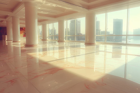 Modern Urban Commercial Space Featuring Shiny Polished Floors and Reflective Architectural Elements