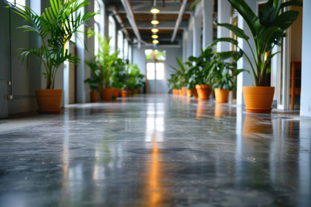 A serene indoor hallway featuring natural light streaming through large windows, complemented by lush greenery, creating a peaceful atmosphere perfect for relaxation.