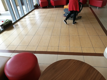 Polished floor tiles in hotel lobby with wet floor sign and gleaming surface
