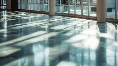 Captivating interplay of light and shadow across a polished floor in a modern interior space. The large windows enhance the tranquil atmosphere and aesthetic appeal.