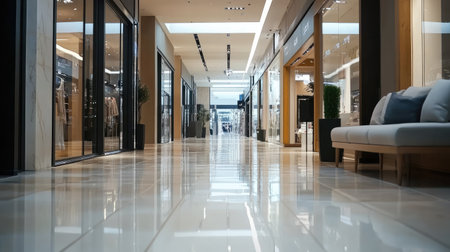 Spacious and modern shopping mall interior featuring a sleek design, bright lighting, and reflective tiles. The clean hallways invite shoppers to explore vibrant retail spaces.