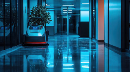 Autonomous floor scrubber at night in an empty office hallway with reflections