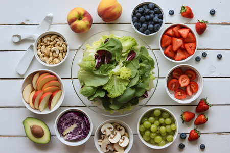 Top-down view of a vibrant salad preparation with mixed greens, fresh fruits, and colorful ingredients on a rustic wooden background. Bright and inviting composition.