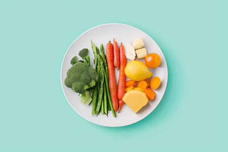 A vibrant arrangement of fresh vegetables and fruits, perfect for healthy cooking. This layout showcases the ingredients for nutritious meals and recipes.