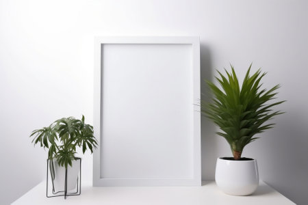 Portrait photo frame mockup on white wall with home plant in pot, blank mockup with copy space for artwork