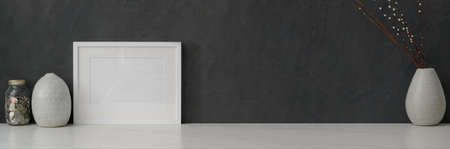 Close up view of white concept worktable with supplies, mock up frame, decorations and copy space