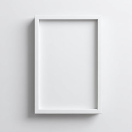 A clean and empty white frame rests against a plain white wall, perfect for showcasing your artwork or photos in any minimalist or modern space.