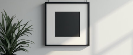 A striking black square artwork is elegantly framed and displayed against a soft, light-colored wall, complemented by a lush green plant nearby. The interplay of shadows and light creates a serene atmosphere, inviting contemplation and appreciation of simplicity in art.