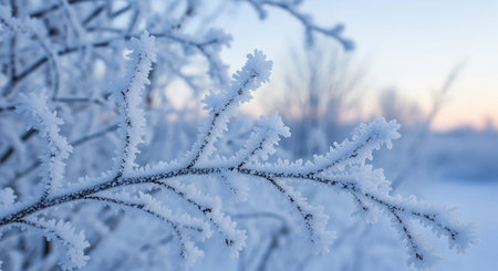 Delicate frosty branches illuminated by soft morning light in a serene winter landscape, creating a tranquil and beautiful atmosphere.