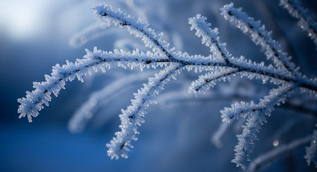 Delicate showing extreme close-up macro shot of a delicate pine branch heavily coated in intricate ice crystals and frost formations against a soft...
