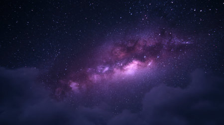 Captivating view of the Milky Way galaxy painted against a dark night sky, featuring stars and clouds, ideal for illustrating cosmic wonders and exploration.