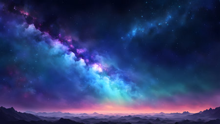 A panoramic view of the Milky Way galaxy, showcasing vibrant colors, sparkling stars, and swirling cosmic dust.