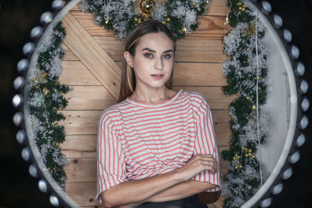 Portrait of a girl in stylish festive interior with New Year decorations. Christmas and New Year concept.