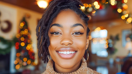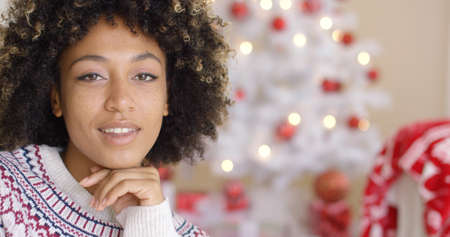Portrait shot of young African American curly woman in yellow sweater smiling to the camera. The Christmas tree background. Inside. Close up