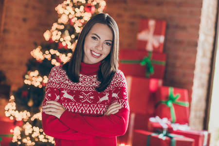 Photo of cheerful pretty young woman dressed red sweater celebrating new year arms folded smiling indoors room home house