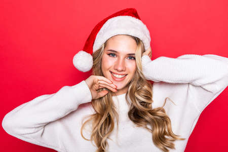 santa girl in white t-shirt posing over white background. christmas, x-mas, winter, happiness concept - smiling woman in santa helper hat and white shirt