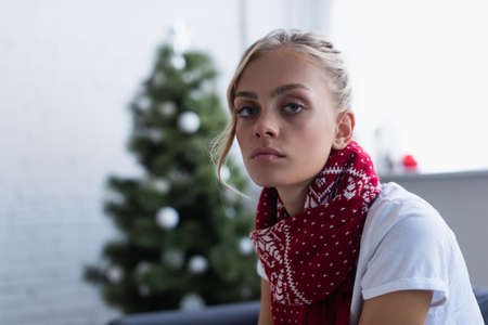 diseased woman in warm scarf looking at camera near blurred christmas tree