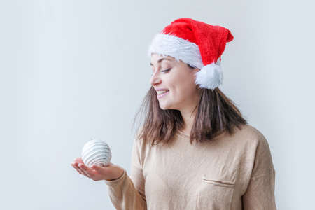 Beautiful girl in red Santa Claus hat holding christmas tree ornament ball in hand isolated on white background. Young woman portrait, true emotions. Happy Christmas and New Year holidays concept