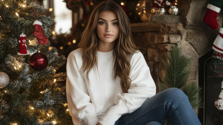 Woman in cozy outfit, surrounded by festive decorations, winter theme